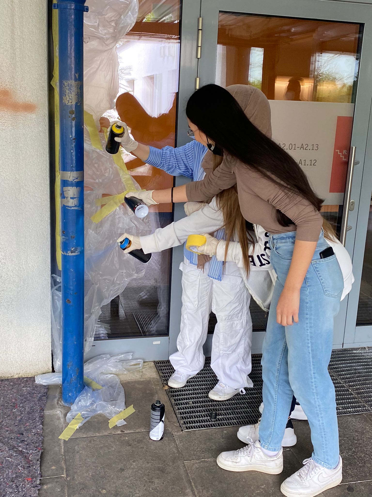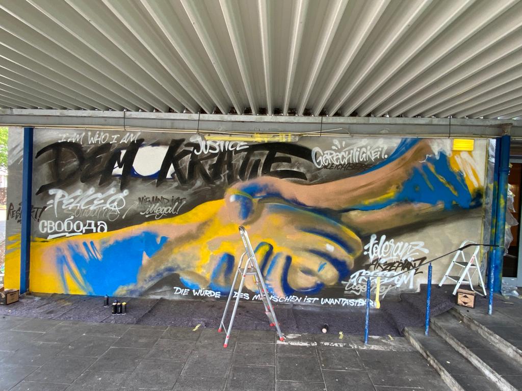Bleibenden Eindruck hinterlässt das Ergebnis des Kreativworkshops mit einem imponierenden Graffiti zum Demokratieverständnis der jungen Künstlerinnen und Künstler in Europa. Auch der Liedtext der Schülerinnen der Europaklasse „PEACE for You“ zeigt die ernsthafte Auseinandersetzung mit den heutigen Herausforderungen v.a. vor dem Hintergrund des Ukrainekrieges und beeindruckte die Zuhörerinnen und Zuhörer.