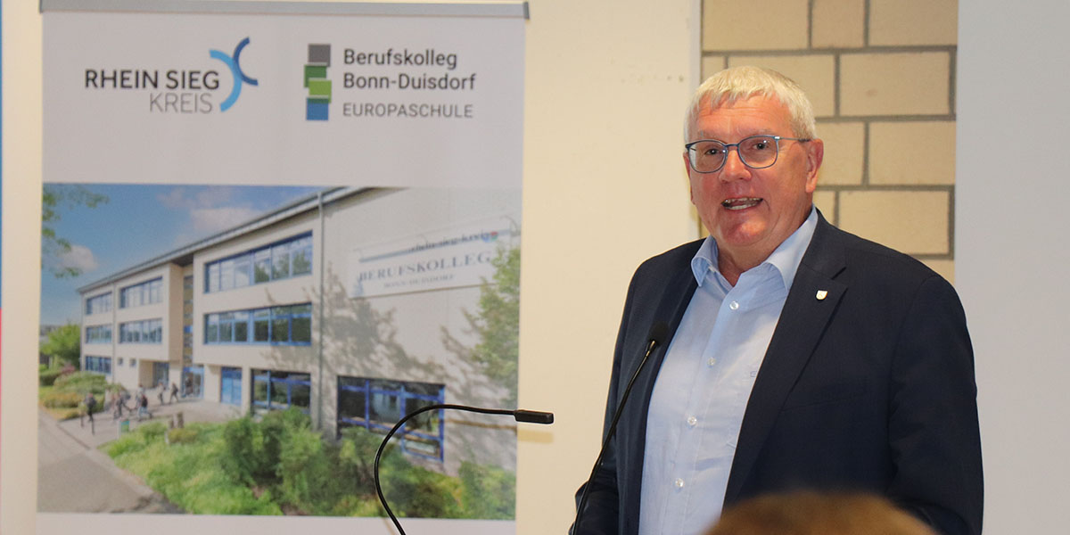 Gemeinsam mit unserem Schulleiter Dirk Thomas eröffnete Landrat Sebastian Schuster den Europatag: „Ich lade Sie und Euch ganz herzlich ein, sich hier und heute auch als Europäer zu fühlen. Ich bin froh, dass der Rhein-Sieg-Kreis die Durchführung des Europatags am Berufskolleg unterstützt. An dieser Europaschule wird ganz viel Wichtiges geleistet“, hob Landrat Schuster hervor.