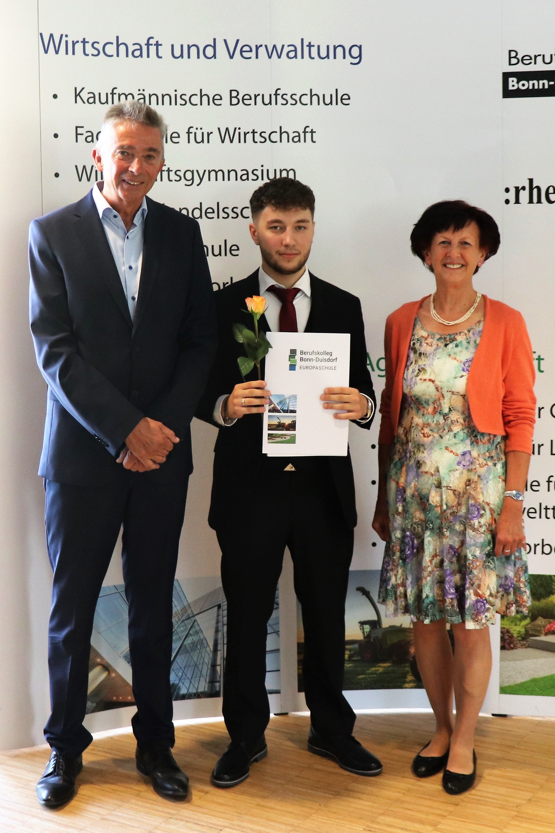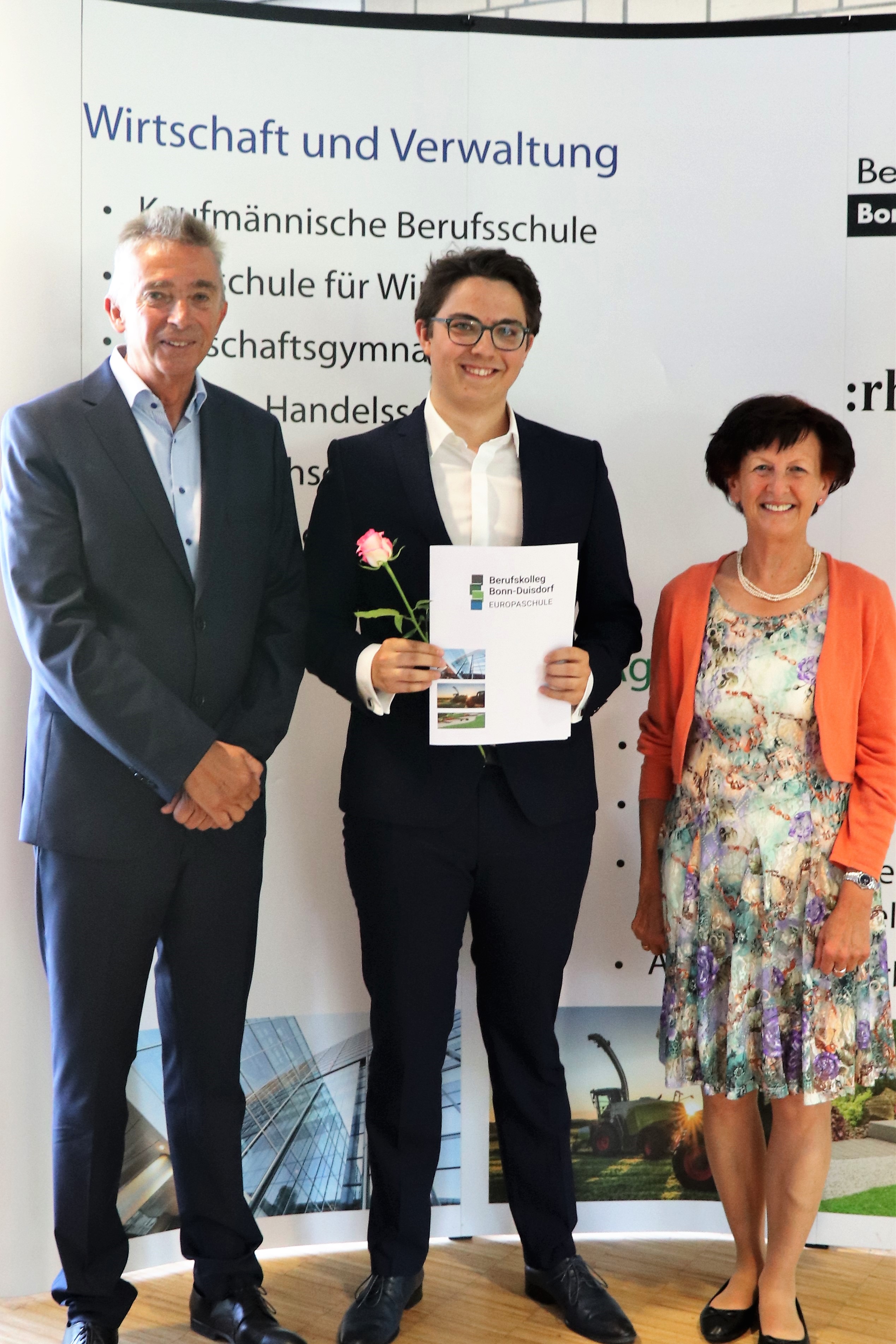 „31 Abiturientinnen und Abiturienten unterzogen sich in diesem Jahr der Abiturprüfung. Wir gratulieren allen zu ihrem Erfolg!“, freute sich auch Christian Hildebrandt, Leiter des Wirtschaftsgymnasiums am Berufskolleg Bonn-Duisdorf. Die beste Abiturnote von 1,2 erreichten Felix Langer und Marc Lenzen. Darüber hinaus wurde Lisa Richter, Abiturnote 1,6, für ihr hohes soziales Engagement ausgezeichnet.