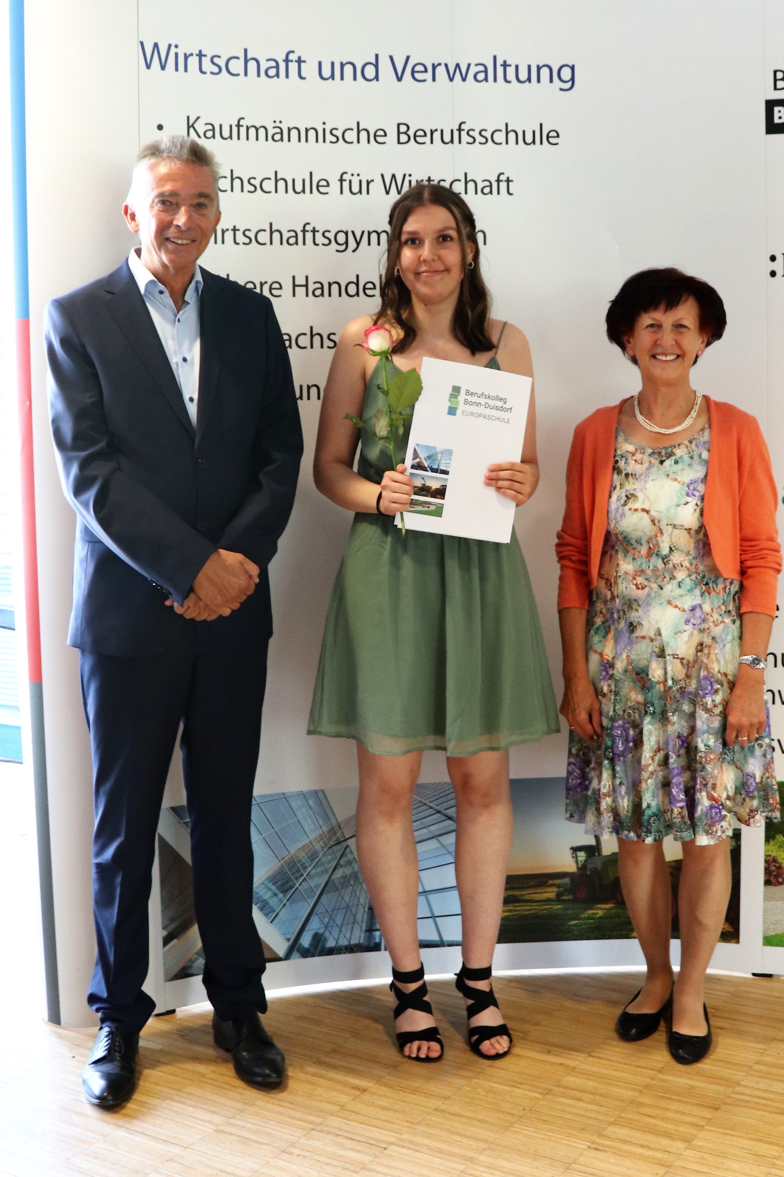 Die stellvertretende Landrätin des Rhein-Sieg-Kreises, Notburga Kunert, überreichte die Abiturzeugnisse, gemeinsam mit Schulleiter Dirk Thomas, persönlich: „Die Entscheidung hier, auf diese Art und Weise weiter zu lernen, war in jedem Fall eine gute. Am Wirtschaftsgymnasium konnten Sie Kenntnisse erwerben, die Ihnen für Ihre berufliche Zukunft auf jeden Fall sehr nützlich sein werden“, so die stellvertretende Landrätin Notburga Kunert. Gleichzeitig dankte sie den Lehrkräften und Verantwortlichen des Wirtschaftsgymnasiums, die die Schülerinnen und Schüler auf dem Weg zum Abitur und zum weiteren Fortgang, sei es im Studium oder Ausbildung und Arbeitsleben mit oftmals wertvollen Entscheidungshilfen unterstützten.